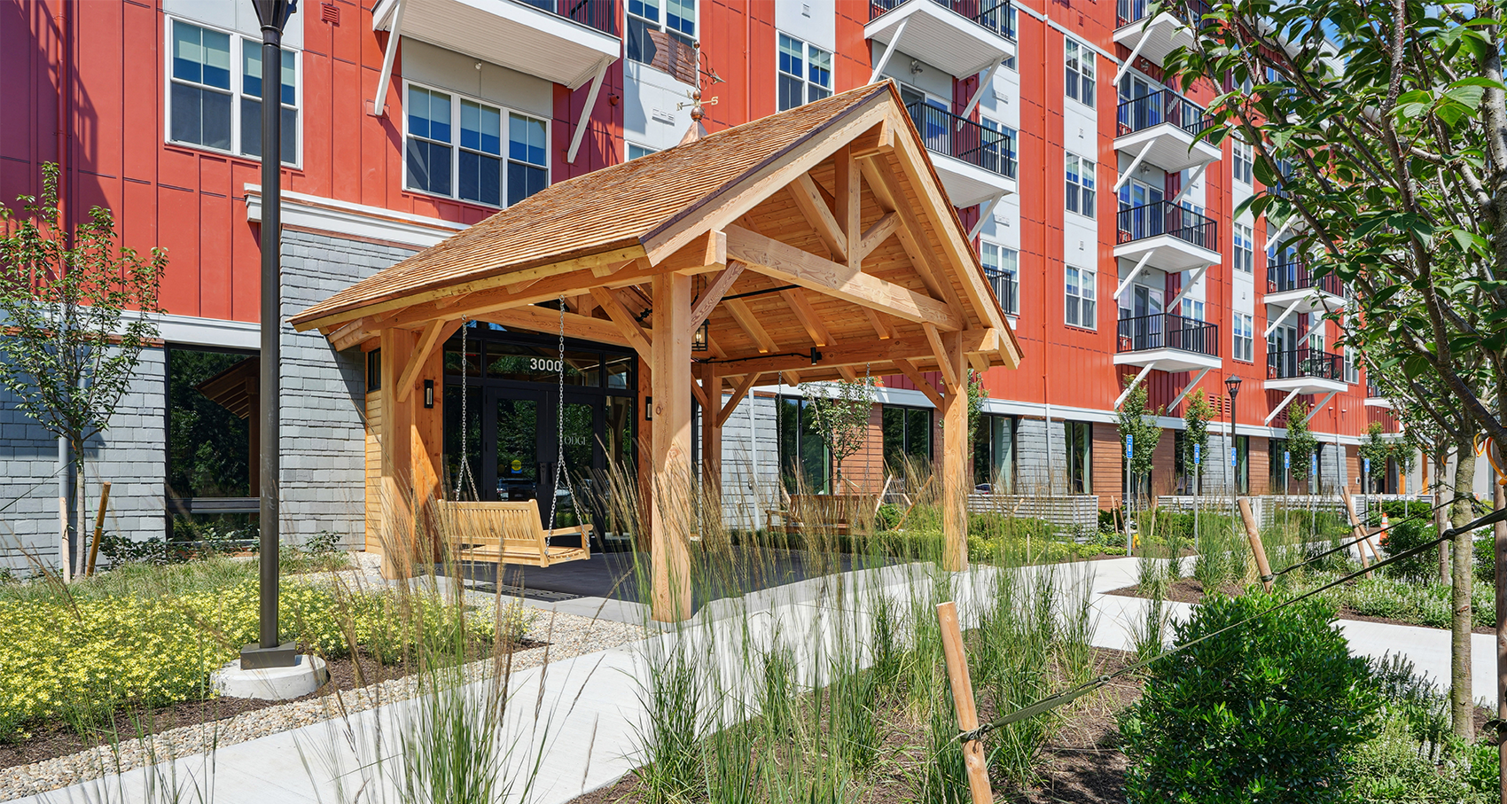 This building is the modern design with 260 units with a mix of studio, one, two and three bedrooms, which are ideally located near I-90 and I-495 for suburban commuters. Extensive amenities include a great room, fitness center, yoga, spinning, and work center. The great room opens to an outdoor courtyard with access to a salt water swimming pool, nature trails, grilling area, and protected wetlands. The roof deck provides spectacular sunset viewing across the rolling landscape.